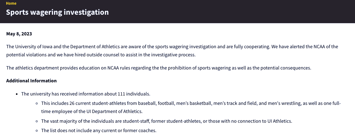 Some 41 student-athletes between the two institutions are alleged to have bet on sports. From the University of Iowa’s athletics department earlier this week: