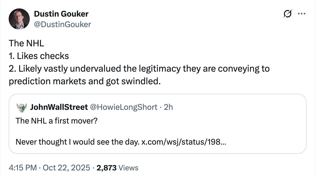 After we hit the Publish button on this morning’s newsletter, word landed from the National Hockey League that Kalshi and Polymarket are joining the league as official prediction market partners.
