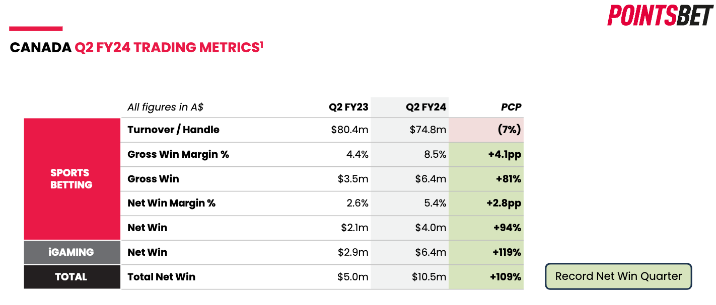 PointsBet is an exception. The Aussie-owned operator released its Q2 financials this week, and the numbers paint a rosy picture for the company’s efforts in the Great White North (we write this having very little knowledge as to how PB is faring with its competitors in a crowded Ontario market because of the lack of information provided by those competitors).