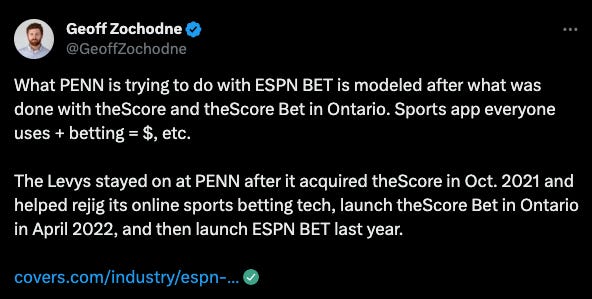 When Penn acquired the Canadian sports media/sports betting company for $2 billion (a combo of Amarican bucks and stocks) in the summer of 2021, it was agreed that theScore founder John Levy and sons Benjie, Aubrey and Noah would stay on and support theScore’s entry into the regulated Ontario gambling industry in April 2022. Since then, theScore has provided tech support to Penn’s partnership with Barstool Sports, and more recently, the departure of Barstool and the arrival of ESPN to create ESPN Bet.