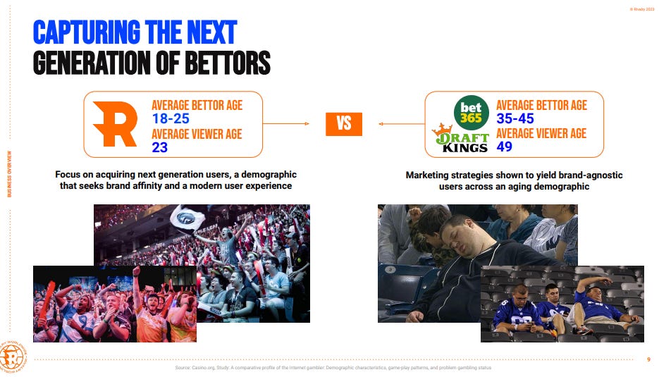 “. . . . understanding where esports comes from, which is gaming culture, and understanding that gaming, of which esports is a subset, is by far the largest content category on the internet for <30's, and therefore a fixture of modern internet culture, will unlock the true opportunity... the demographic. The TAM (total addressable market) of that demographic in online gambling is massive, and will eventually overtake the current 35+ demo as time goes on. That demographic TAM is infinitely > solely esports betting TAM.”