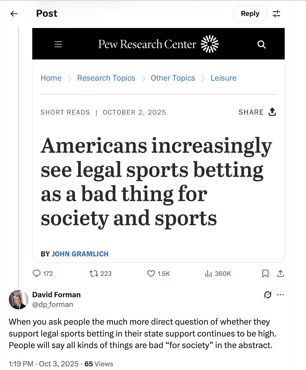 Meanwhile, Ruddock also reported that the American Gaming Association’s head of research, David Forman, posted on X that the answers are reflective of the questions asked. “When you ask people the much more direct question of whether they support legal sports betting in their state, support continues to be high,” Forman posted. “People will say all kinds of things are bad ‘for society’ in the abstract.”