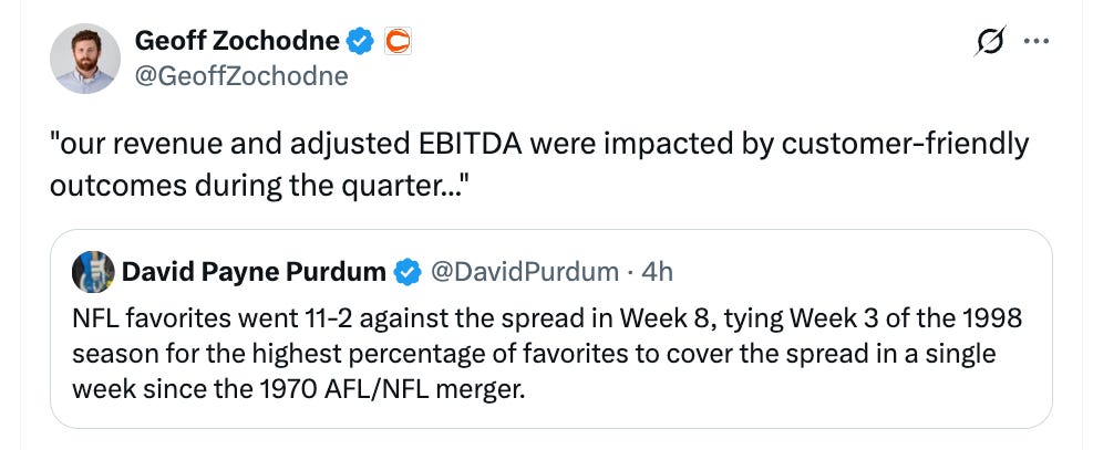 Geoff Zochodne of Covers also confirmed customers tended to beat the books on NFL games of late with this tweet: