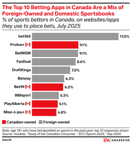 Briggs, the Senior/Principal Analyst for EMARKETER’s Canadian business did a rather deep dive into the report. That included the ongoing power of live sports for consumers in-stadium and watching from the comfort of their living rooms, in a bar, in a train or at an airport gate. Vividata’s survey also revealed that one-third of sports bettors are wagering at least once a week and 5% are betting daily. Briggs and host Steve McAllister also mentioned the 10 most-engaged sportsbook apps in Canada including three from provincial lottery and gaming corporations.